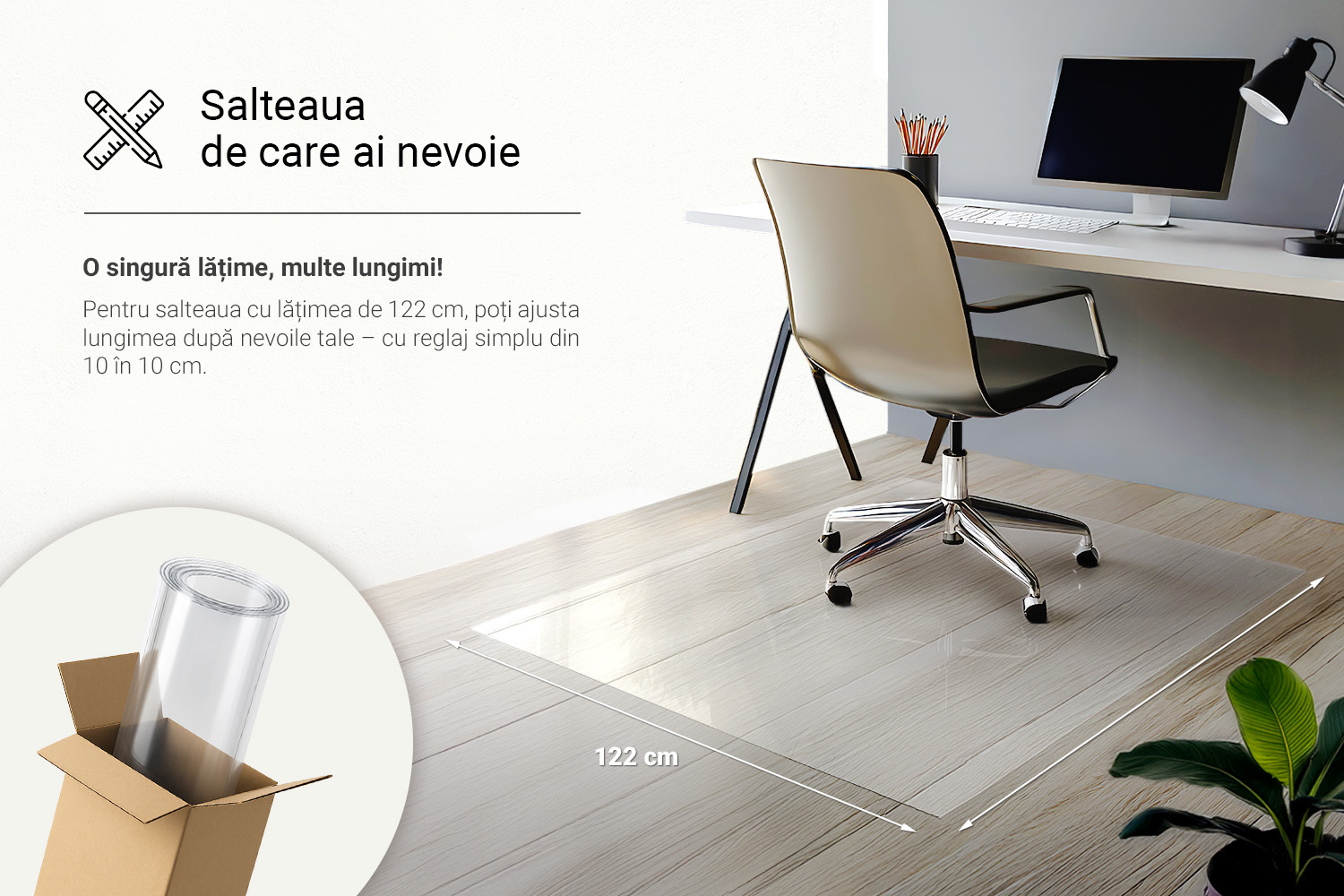 Covoraș de protecție transparent de înaltă calitate, cu grosimea de 2 mm. Realizat din PVC durabil, ideal pentru protejarea pardoselilor, birourilor sau blaturilor. Rezistent la apă, hipoalergenic, antiderapant și ușor de curățat. Tăiat la comandă – lățimea este fixă, 122 cm, iar lungimea se stabilește la comandă, în trepte de 10 cm. Produs polonez, creat pentru confortul și estetica de zi cu zi.